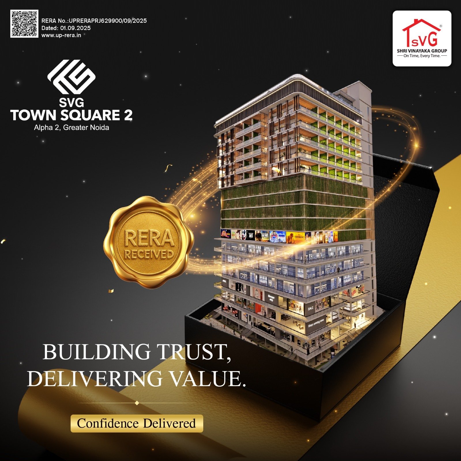 In Sector Alpha II, Greater Noida, the Shri Vinayaka Group’s SVG Town Square 2 is a new launch commercial plaza featuring stores, offices, and studio flats.